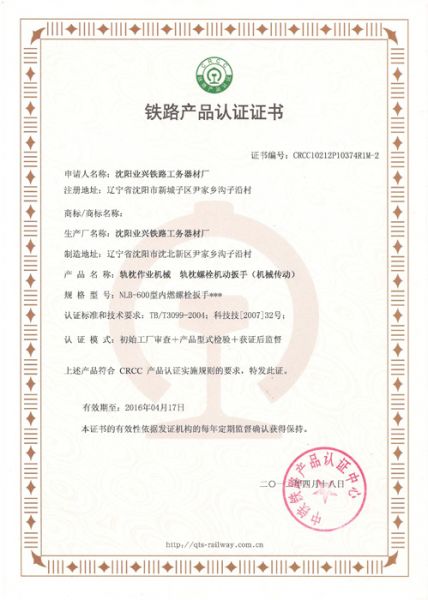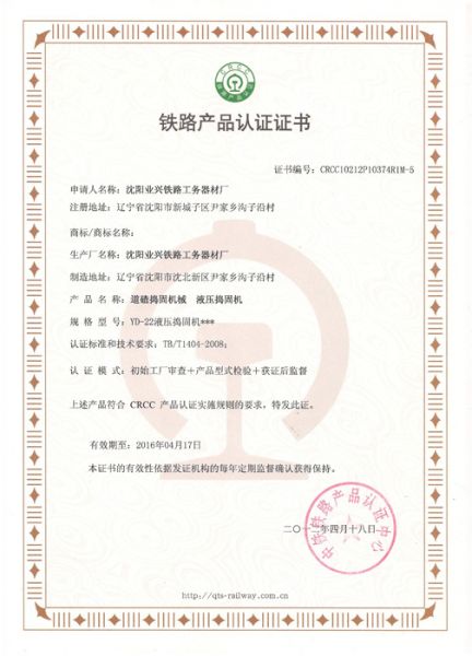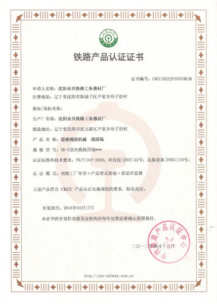 | 持证单位: 沈阳业兴铁路工务器材 |
